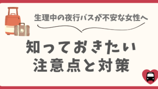 夜間に長距離移動する夜行バス。生理と被ってしまうと不安ですよね…でも安心してください。結論、生理中でも夜行バスは乗れます!今回は、夜行バスに100回以上乗車経験のある筆者の実体験をもとに生理中の夜行バスでの注意点と対策についてご紹介します。...